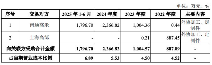 申报材料显露:报告期各期,刊行东谈主向关联方南通高米采购金额差异为0.44万元、1004.36万元、2366.82万元和1796.70万元;2022年和2023年,刊行东谈主向关联方上海高郜采购金额差异为887.45万元、0.21万元,刊行东谈主在2023年后未再朝上海高郜采购。报告期内,刊行东谈主推断向两家关联方采购占报告期营业资本比例差异为4.52%、4.50%、5.53%、6.89%。